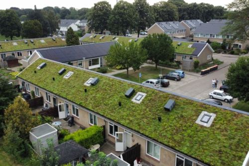 Voor hellende daken heeft Sempergreen een groendaksysteem ontwikkeld dat één op één de bestaande dakpannen kan vervangen. De zogenoemde groendakschalen worden eenvoudigweg op de bestaande panlatten aangebracht. Het systeem is waterkerend en dampopen, zodat de bouwfysische eigenschappen van het dak niet veranderen. Het is ook nog eens volledig recyclebaar. Naomi Reitsema van Sempergreen ziet dat ook woningcorporaties hiervoor belangstelling hebben. “Ze kunnen dan bijvoorbeeld de ene zijde van het dak vergroenen en de andere zijde benutten voor PV-panelen, maar die kunnen ook geïntegreerd worden in het groen.”