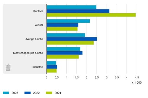 De meeste woningen ontstaan in voormalige kantoorpanden, namelijk 2,5 duizend (28 procent van het landelijk totaal aan woningtransformaties). Dit aantal is de afgelopen jaren afgenomen. In 2022 en 2021 werden respectievelijk 3,1 en 4,5 duizend woningen gerealiseerd in voormalige kantoorpanden. Het aandeel woningtransformaties uit industriepanden bleef ongeveer gelijk. Het aandeel woningtransformaties uit panden met een maatschappelijke functie, zoals onderwijs of gezondheidszorg, steeg licht; het absolute aantal daalde wel ten opzichte van vorig jaar.
